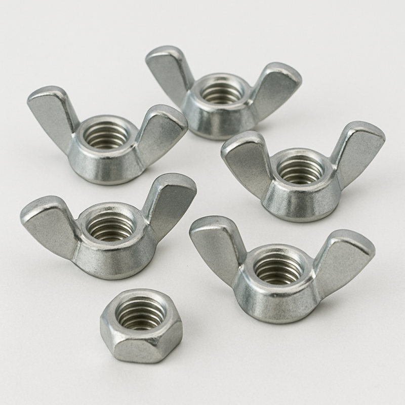 손으로 쉽게 조일 수 있는 나비 모양의 너트입니다.